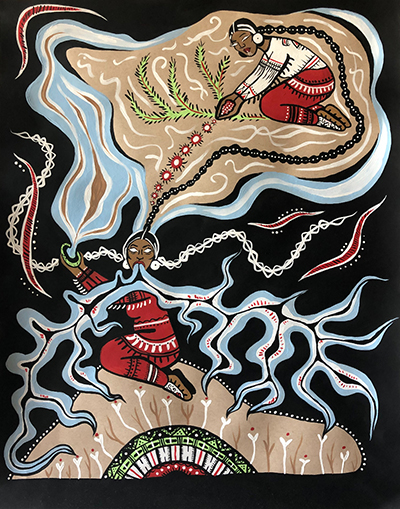 As Indigenous people, we are artists at heart. From our bodies stems creation. We are the creators of beauty and of life. In every medium, this creation speaks to me. From mind to hands, art is brought to life. As Indigenous women, we are the givers of life, natural born artists. Our long roots reach deep below the ground and reclaim knowledge. Our hands stretch high into the stars and bring down the living Spirit. We are mothers of creation, creative mothers.
